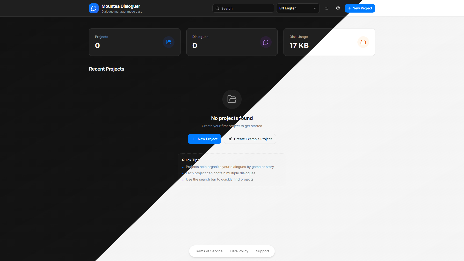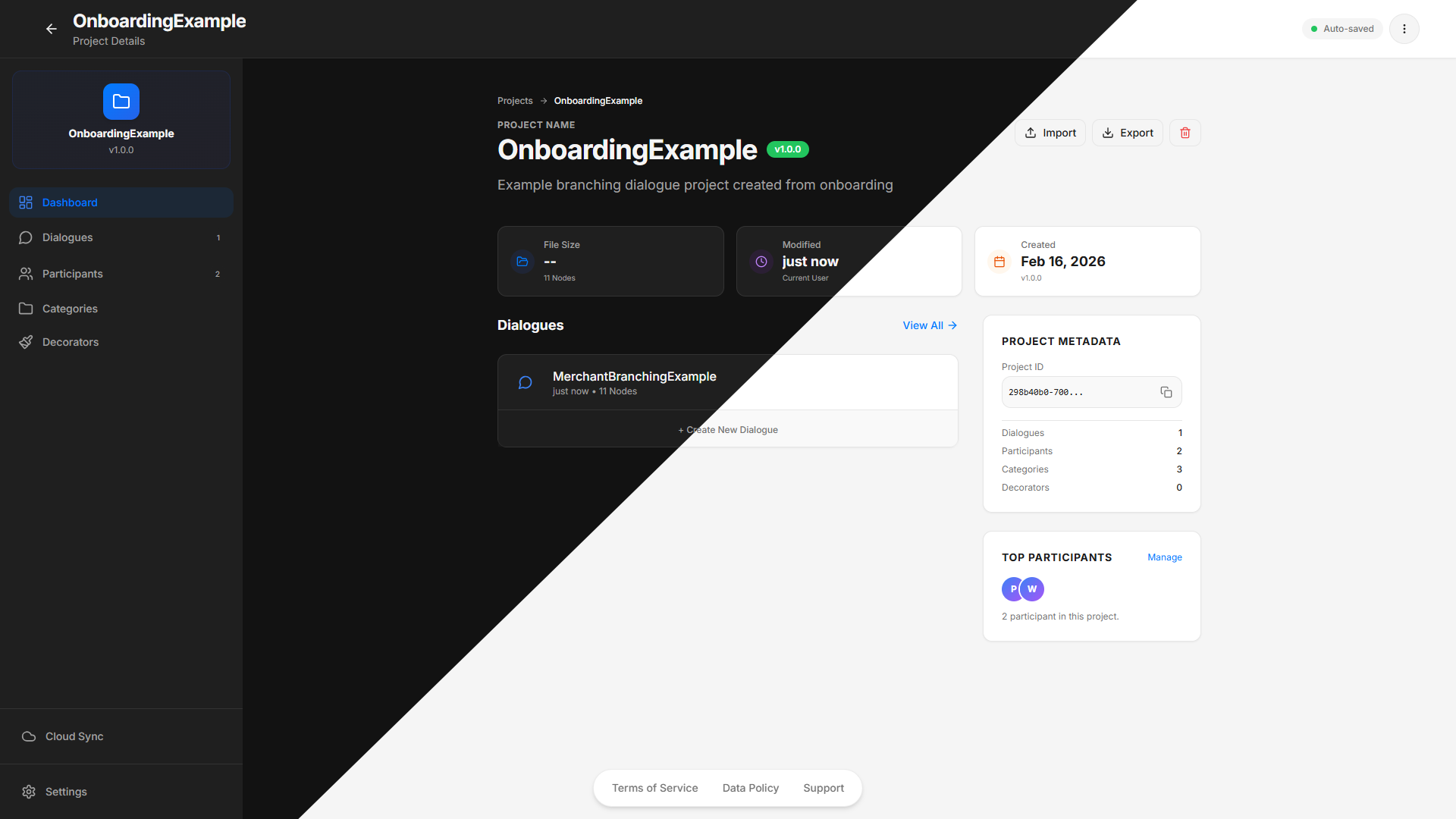 A project is your narrative workspace. Each project contains dialogues. Each dialogue is authored as a visual graph.