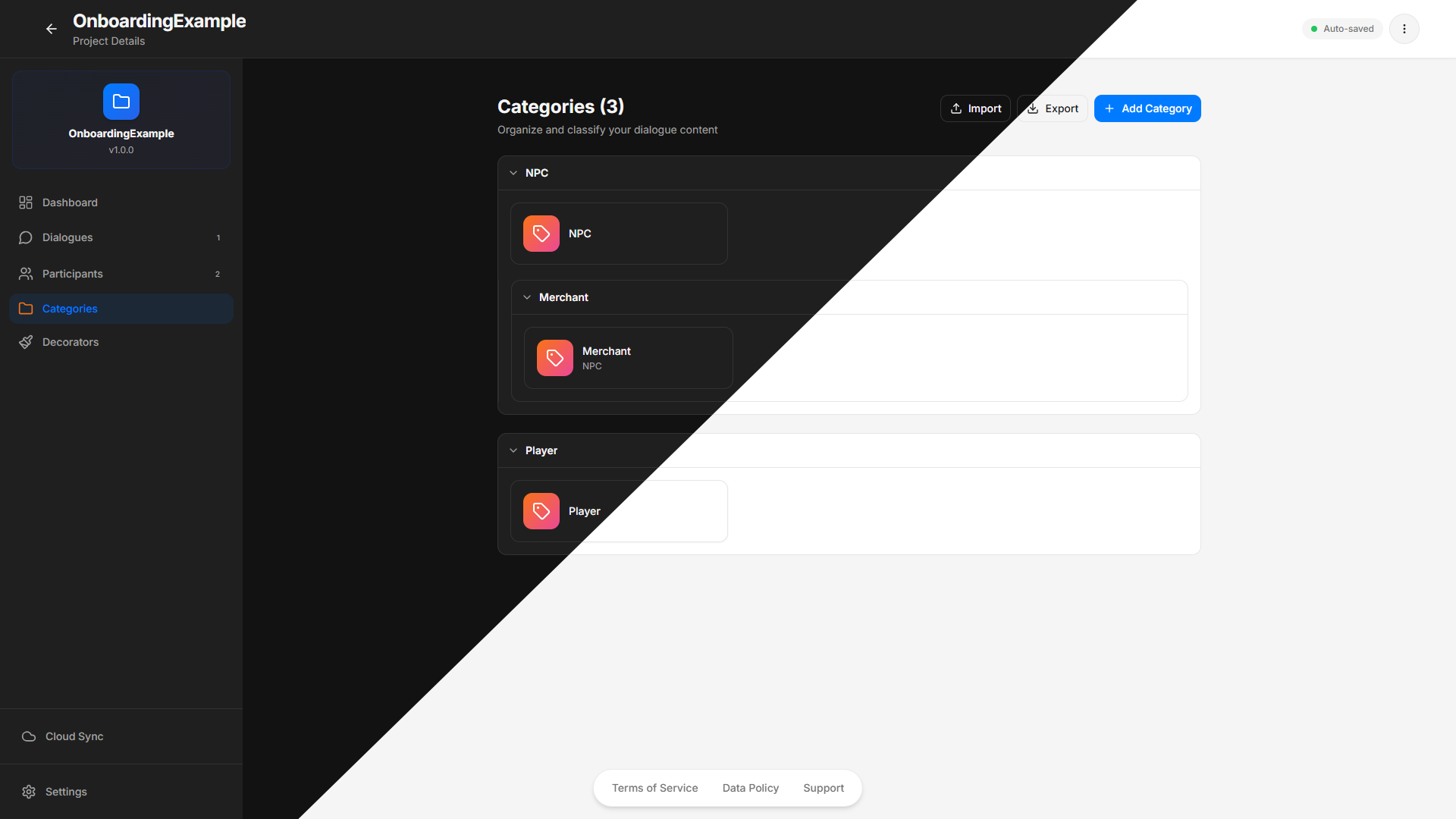 - Reusable dialogue metadata (participants, categories, decorators)