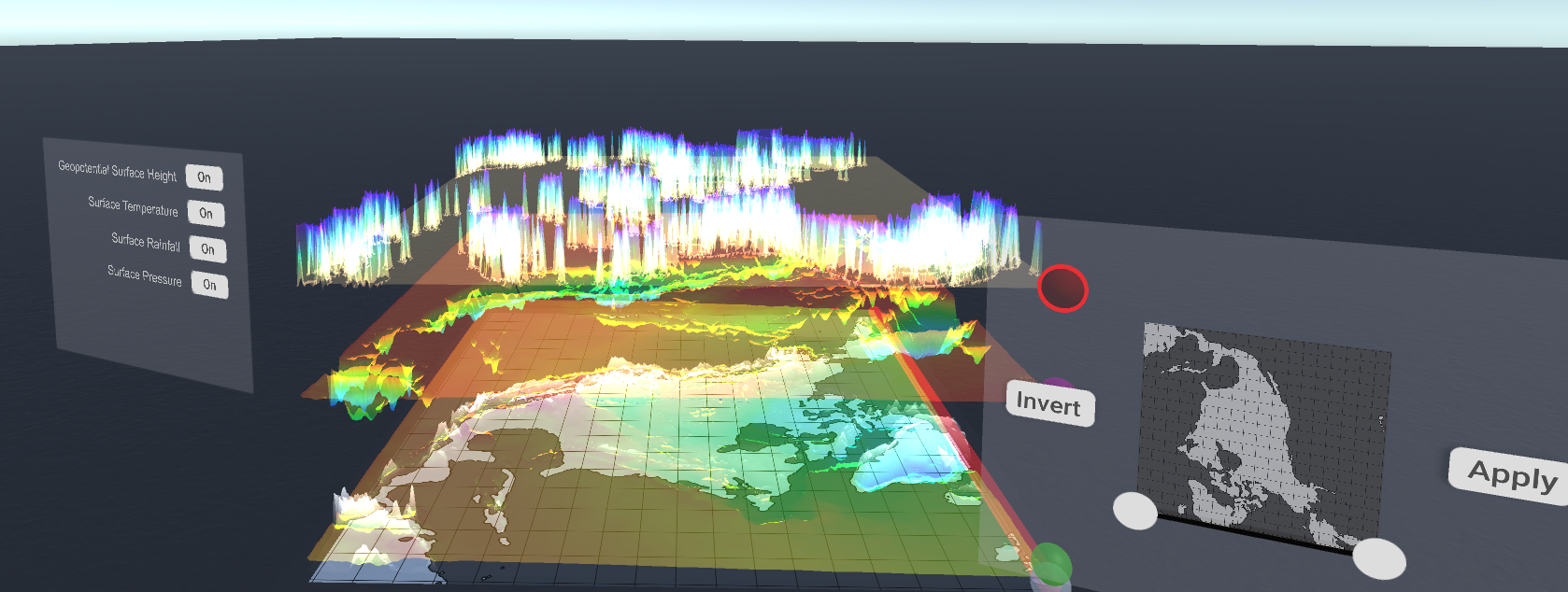 Our goal with this project is to demonstrate the effectiveness of visualising complex spatial data using virtual reality compared to traditional computer visualisations (e.g., 2D graphs on a conventional display). We're using the Leap Motion hand tracker to enable interaction with the visualisation. This allows you to reach out and manipulate the display with no controllers attached to your hands.