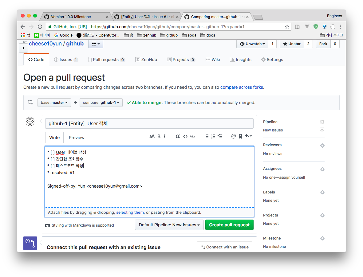 반드시 해당 풀리퀘스트가 무슨 이슈에 따른 요청인지 명시하시는 것을 권장합니다. 그렇게 되면 위 그림처럼 해당 이슈에 #2[방금 요청한 풀리퀘스트]가 연결되어 해당 이슈가 무슨 코드로 인해서 진행됐는지 추적하기 좋습니다.