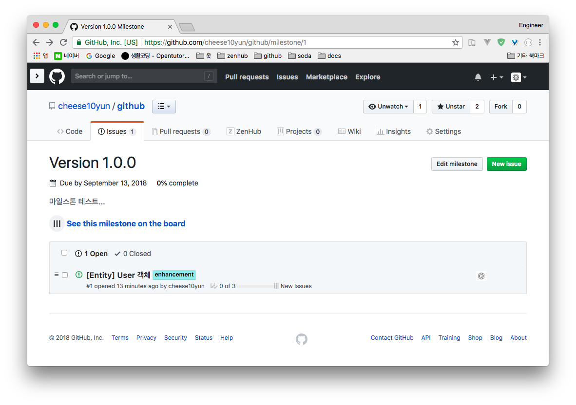 다른 것들은 이해하기 쉬울 텐데 Milestone은 조금 생소할 수 있습니다. Milestone에 간단하게 설명해 드리면 이번 출시 버전이 1.0.0 일 경우 해당 버전이든 이슈(작업) 기능 강화, 새 기능추가, 버그 기타 등등 모든 이슈를 Version 1.0.0 Milestone이라는 항목에 추가하면 위 그림처럼 Version 1.0.0에 대한 전체적인 상황을 한눈에 볼 수가 있는 장점이 있습니다.