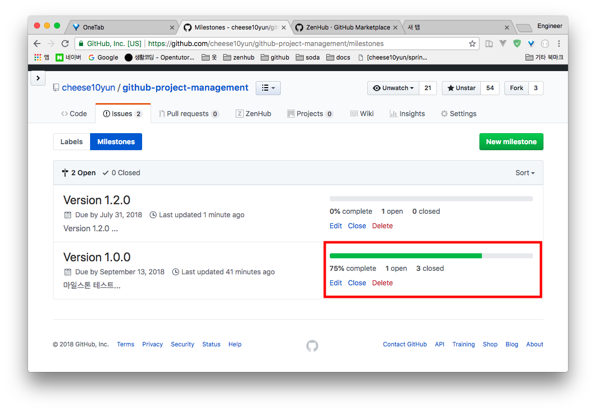 ZenHub 사용과 직접적인 기능은 아니지만, Milestone 여러 항목을 만들고 대부분 Icebox에 있는 issue가 아니라면 적절한 Milestone에 위치시키는 것을 권장합니다. 전체적인 작업에 진행 척도를 가시적으로 확인하기 좋은 점, 해당 Milestone(버전)에 추가되는 기능, 강화되는 기능, 수정된 버그 등을 직관적이로 표시 할 수 있습니다. 또 전체 Milestone 진척도를 알 수 있어 남은 시간도 산출하기 좋은 장점이 있습니다.