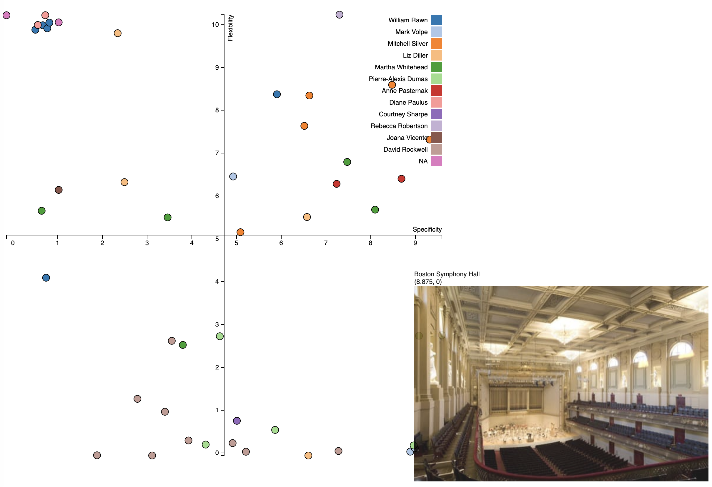 2D and 3D interactive scatterplots investigating the relationship between Flexibility, Specificity, and Inclusivity for cultural spaces discussed in AESTHINT 65: The Future of Cultural Spaces at Harvard University, Spring 2019.
