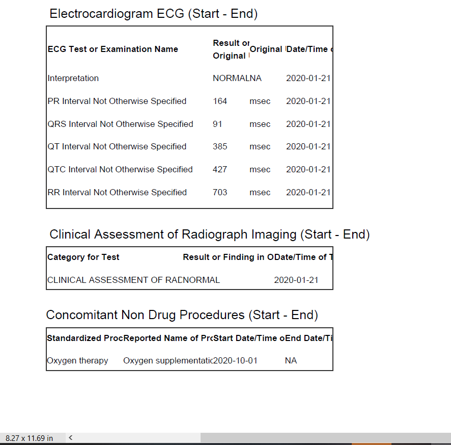 [1] " Electrocardiogram ECG (Start - End)" " Clinical Assessment of Radiograph Imaging (Start - End)" "Concomitant Non Drug Procedures (Start - End)"