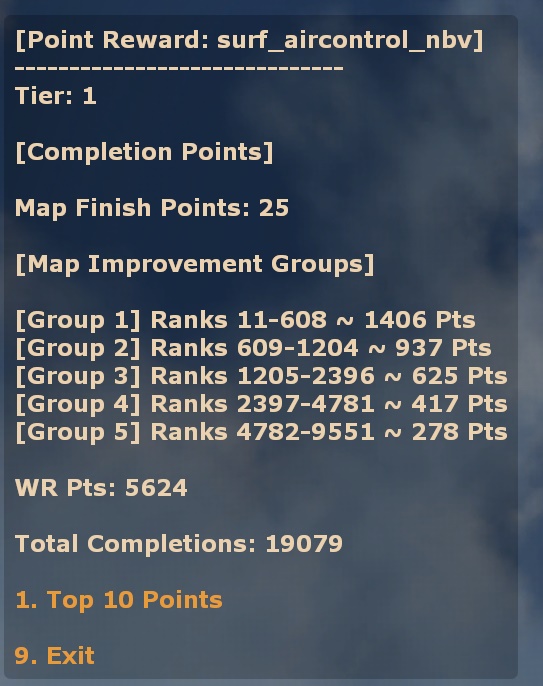 The points system has seen a massive overhaul from the original ckSurf; it is now a percentile tiered system. Points are now distributed in two ways: (1) map completion, and (2) map ranking. Map completion points will be given to all players who complete a specific and are dependent on the tier.